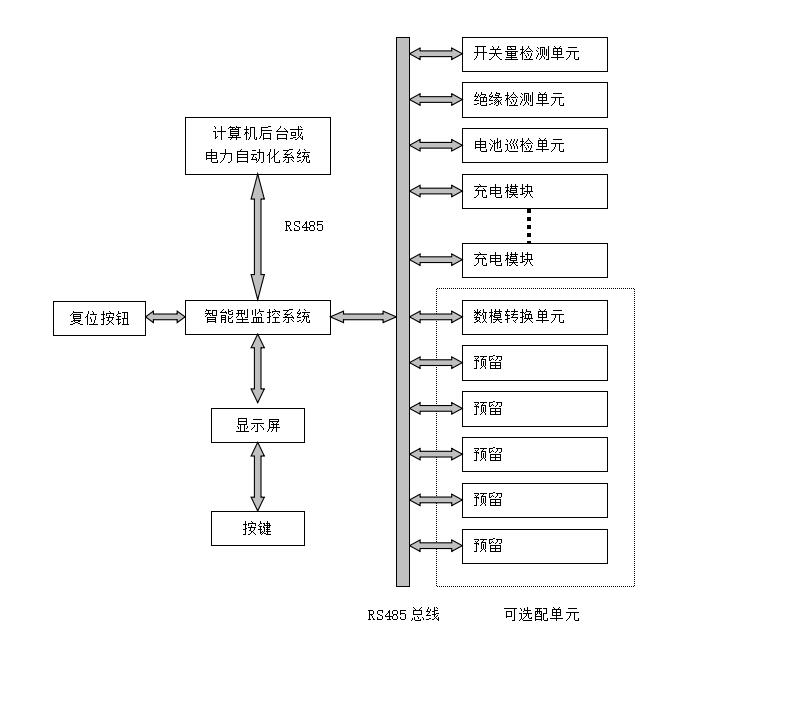 第四代監(jiān)控系統(tǒng)靈活的兼容了電源系統(tǒng)中的各種設備的檢測與控制,系統(tǒng)主要包括主監(jiān)控、開關量檢測單元、電池巡檢單元、絕緣檢測單元,對于特殊的系統(tǒng)還可配置協(xié)議轉換單元和數模轉換單元。其中開關量單元最多可擴展4個單元;充電模塊最多可控制12臺;電池巡檢最多可巡檢24節(jié)電池的電池組;絕緣檢測單元最多可擴展到4個單元共120回輸出回路。對于特殊的模塊可靈活選配協(xié)議轉換單元和數模轉換單元,從而兼容各個廠家所生產的模塊而不至于影響本系統(tǒng)的正常運行。系統(tǒng)組織結構如下圖所示: