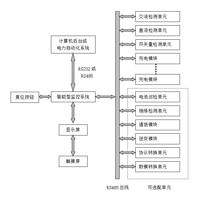 第三代監(jiān)控系統(tǒng)靈活的兼容了電源系統(tǒng)中的各種設(shè)備的檢測與控制,系統(tǒng)主要包括主監(jiān)控、交流檢測單元、直流檢測單元、開關(guān)量檢測單元、電池巡檢單元、絕緣檢測單元,對于特殊的系統(tǒng)還可配置協(xié)議轉(zhuǎn)換單元和數(shù)模轉(zhuǎn)換單元。其中直流檢測單元最多可擴展2個單元;開關(guān)量單元最多可擴展4個單元;充電模塊最多可控制32臺;電池巡檢最多可巡檢2組120節(jié)電池的電池組;絕緣檢測單元最多可擴展到8個單元共240回輸出回路。對于特殊的模塊可靈活選配協(xié)議轉(zhuǎn)換單元和數(shù)模轉(zhuǎn)換單元,如通信模塊和逆變模塊可根據(jù)情況配置協(xié)議轉(zhuǎn)換單元,從而兼容各個廠家所生產(chǎn)的模塊而不至于影響本系統(tǒng)的正常運行。系統(tǒng)組織結(jié)構(gòu)如下圖所示: